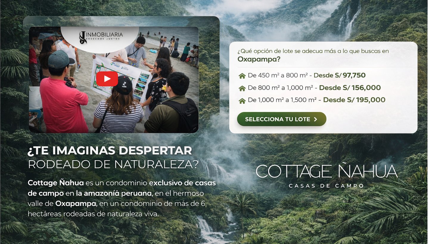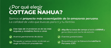 Cottage Ñahua es un condominio exclusivo de casas de campo en la amazonía peruana, dentro del centro poblado de Sogormo, distrito de Campanilla, región San Martín, en un terreno de más de 6 hectáreas rodeadas de naturaleza viva.